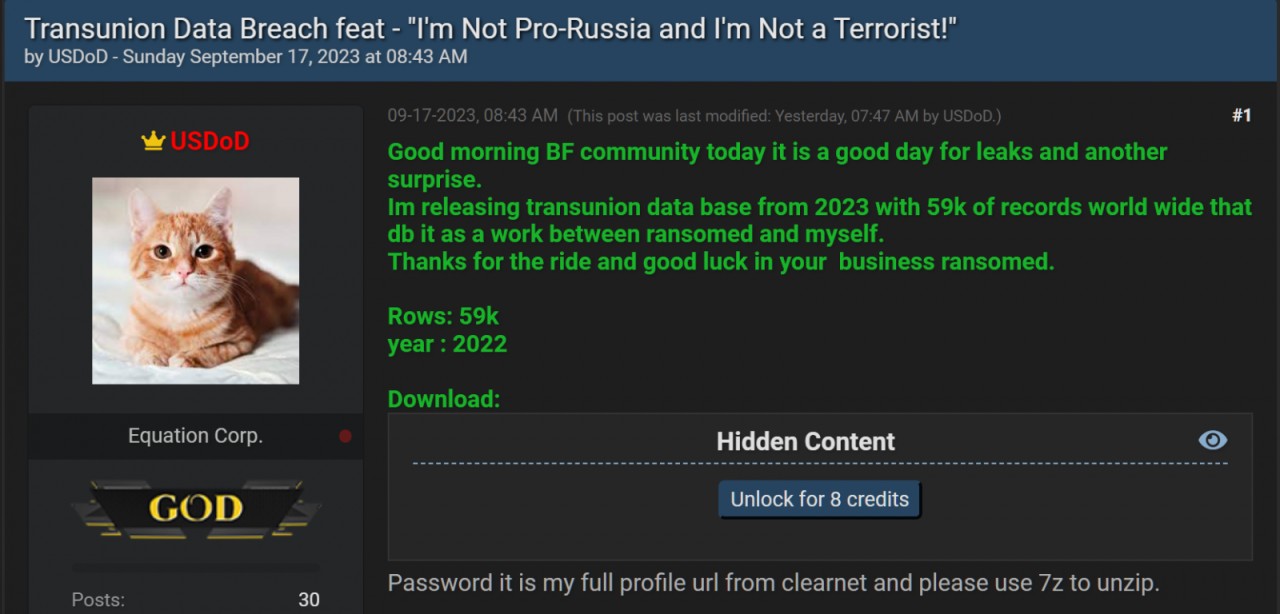 According to the USDoD's listing published on a hacking forum over the weekend, the database allegedly stolen from TransUnion's systems includes a wide range of sensitive information of roughly 59,000 people worldwide.