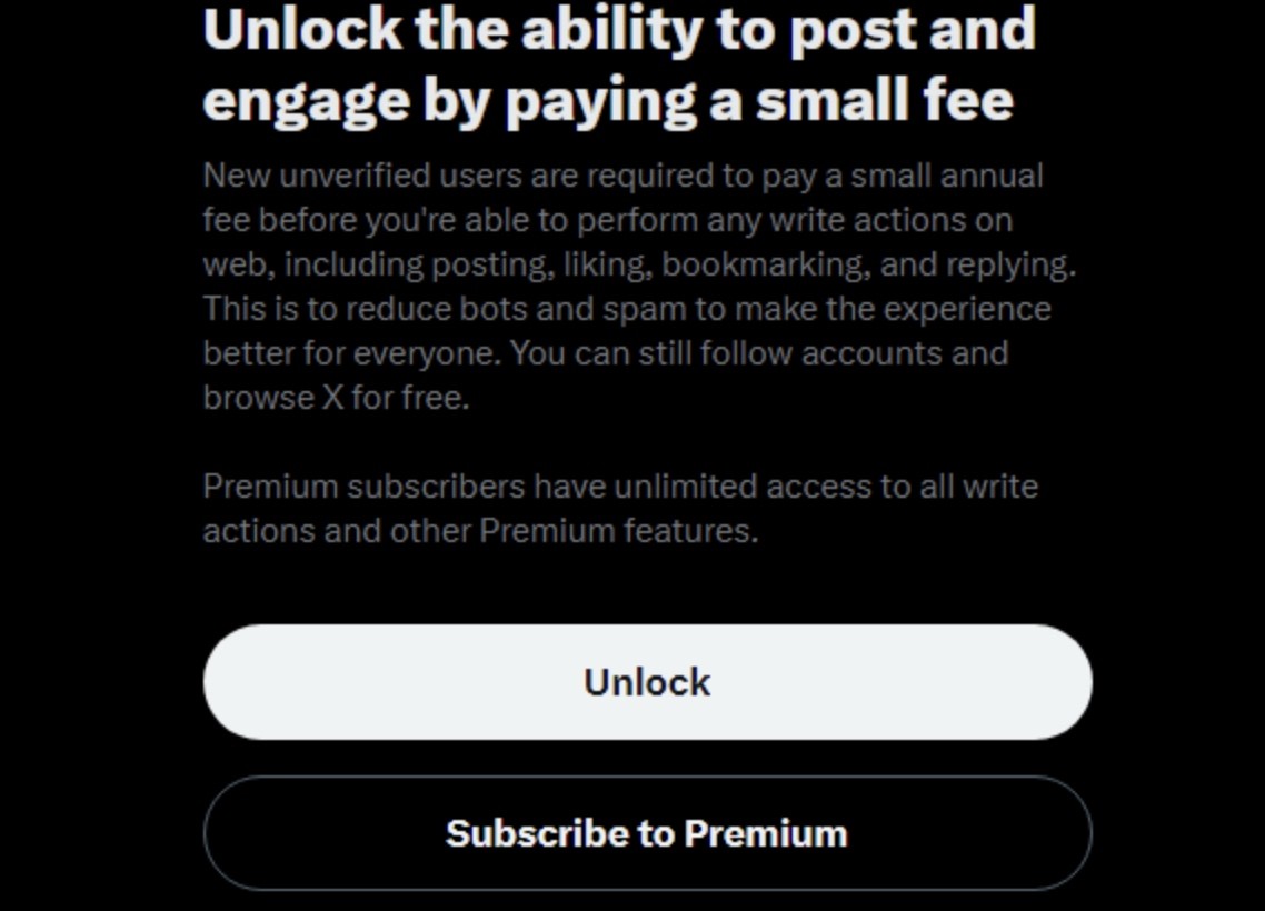 "This is to reduce bots and spam to make the experience better for everyone. You can still follow accounts and browse X for free," users are told when asked to sign up.