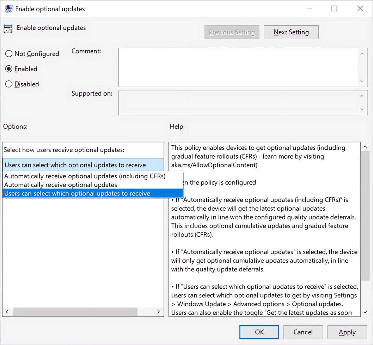 - Group Policy: Computer Configuration\Administrative Templates\Windows Components\Windows Update\Windows Update for Business\Enable optional updates