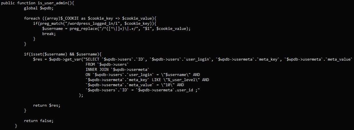 In this case, the flaw impacts the 'is_user_admin' function of the 'WpFastestCacheCreateCache' class within the WP Fastest Cache plugin, which is intended to check if a user is an administrator by extracting the '$username' value from cookies.